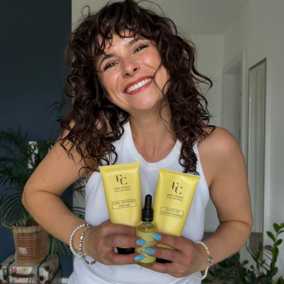Waarom Eve Curls anders is: Onze formules focussen op hydratatie + zachtheid + elasticiteit, niet op zware ingrediënten die alleen op je haar blijven liggen. Het doel is niet harde krullen, maar gezonde, soepele beweging.